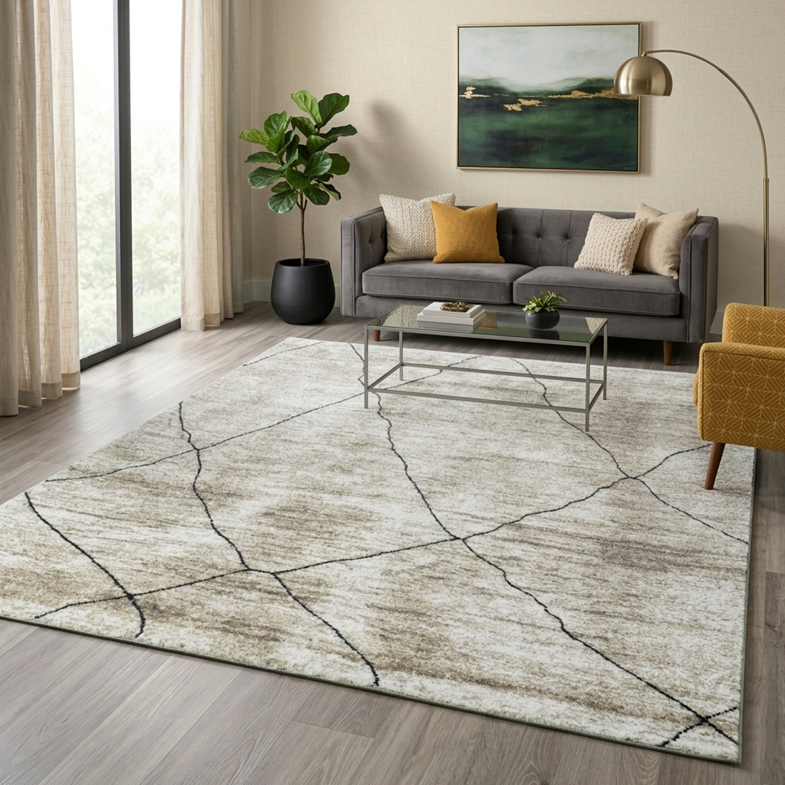 Design Teppich Beige Linienmuster elegant modern Wohnbereich stilvoll