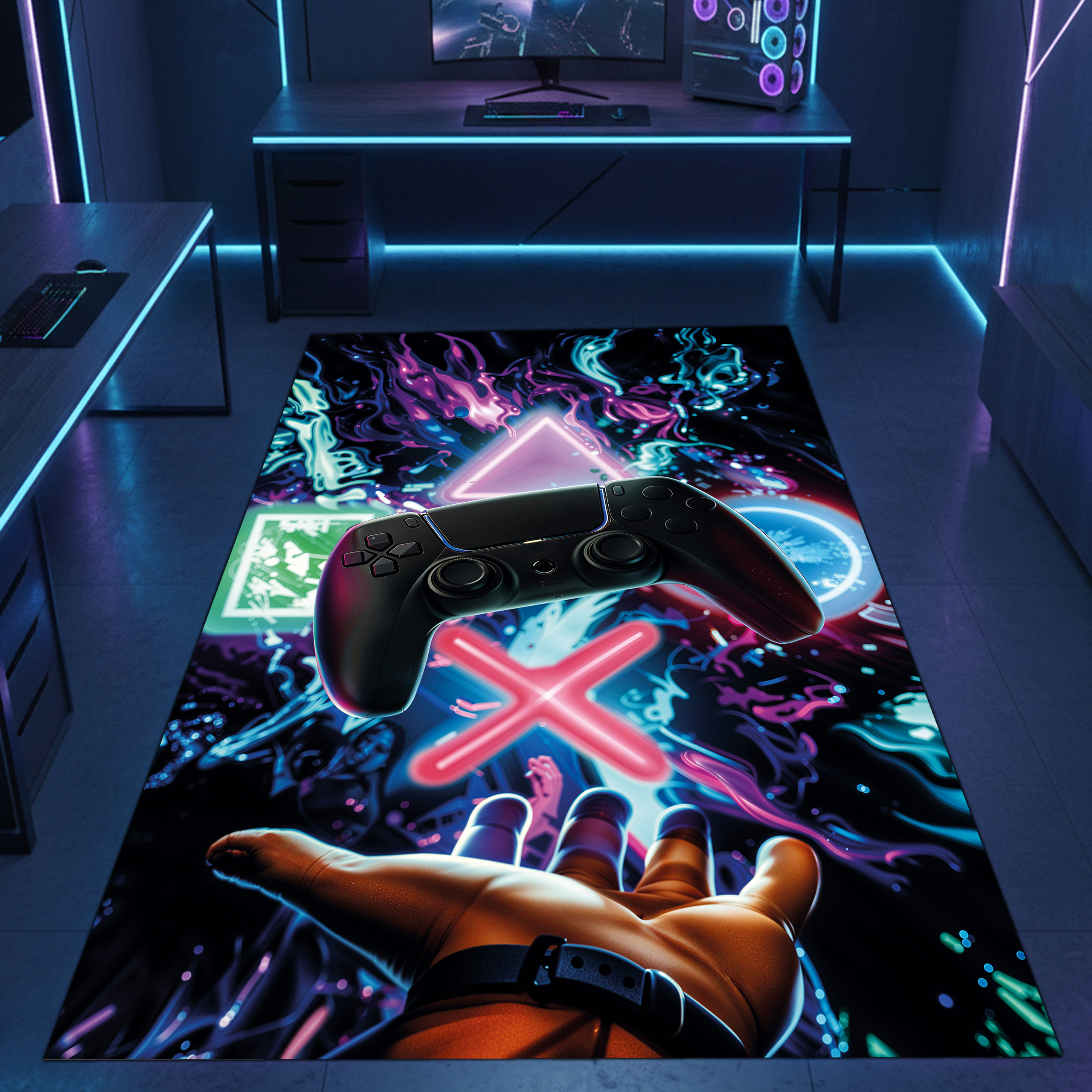 Auffälliger Gaming-Teppich mit lebendig-bunten neon-farbigen Symbolen und schwebendem Controller